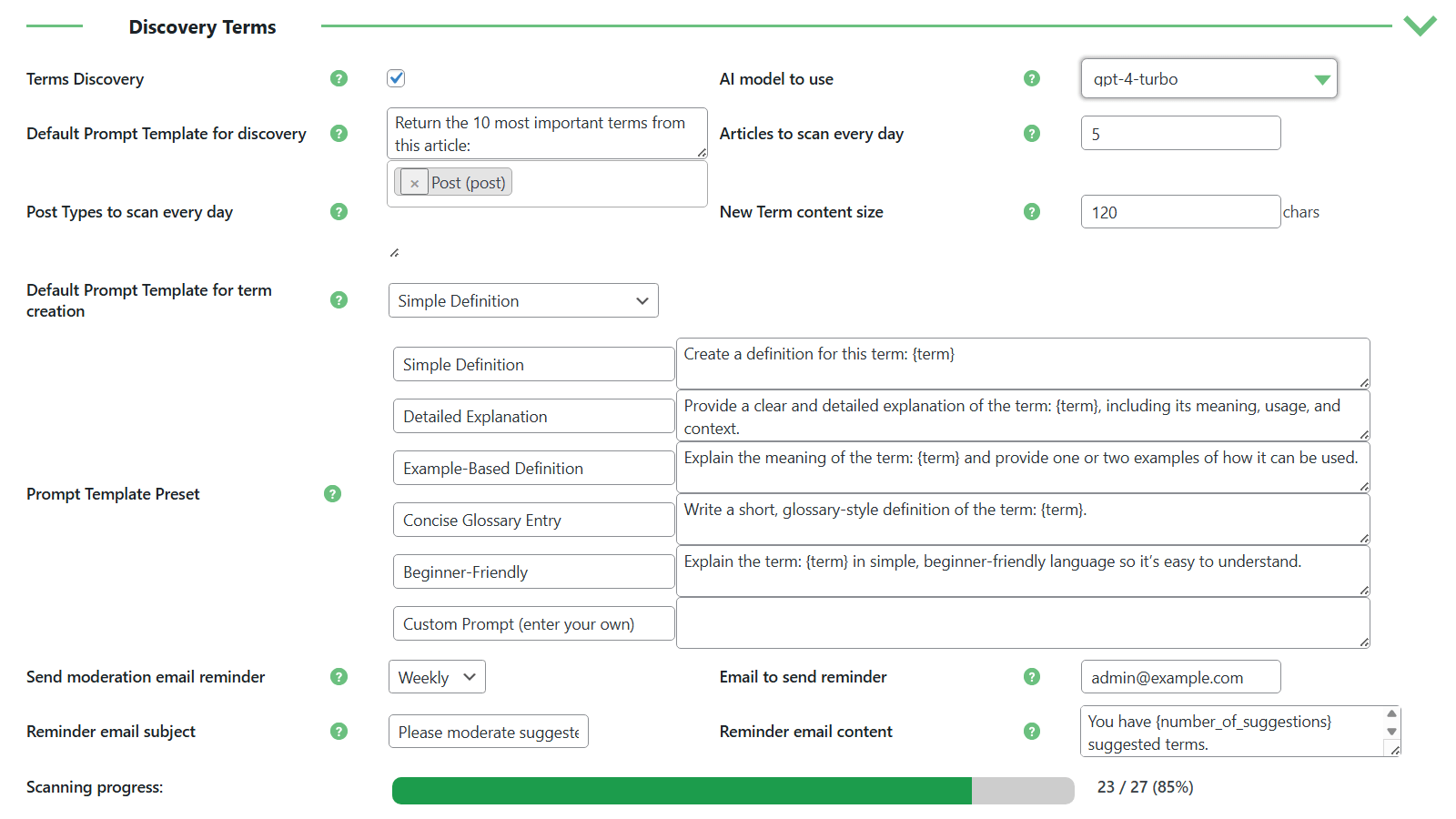 Automatic scanning is useful for sites that update frequently, like blogs, news platforms, or industry sites. Admins can quickly manage suggested terms, keeping the glossary relevant and comprehensive.