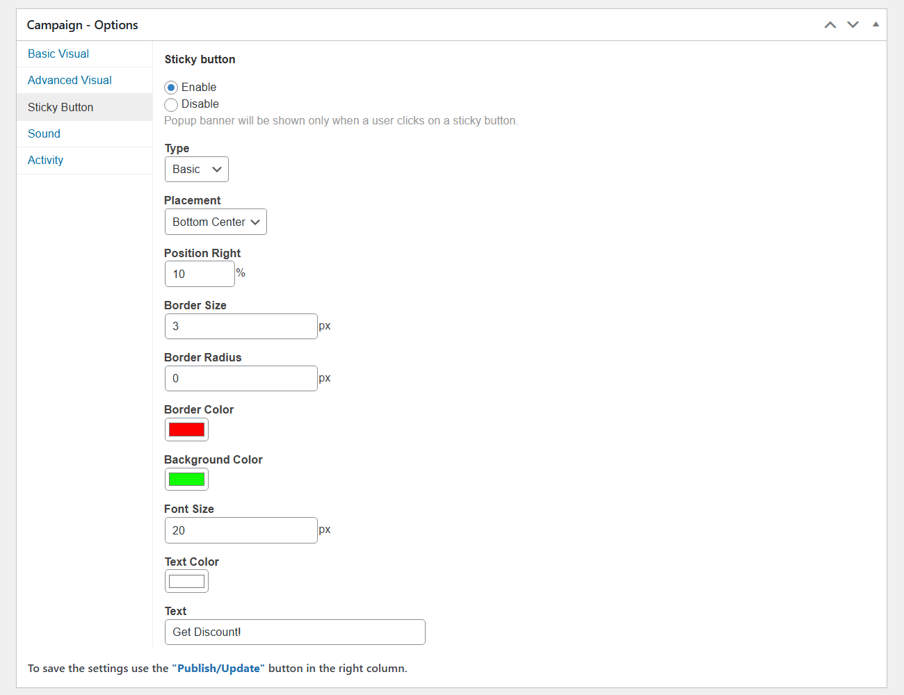 The plugin provides full customization of your sticky button’s appearance and placement: