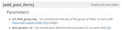 The WordPress Frontend submission plugin supports integration with the plugin Advanced Custom Fields (ACF). It allows you to add custom fields into the post submission form. Learn more: How To Add Advanced Custom Fields (ACF) Into the Submission Form |