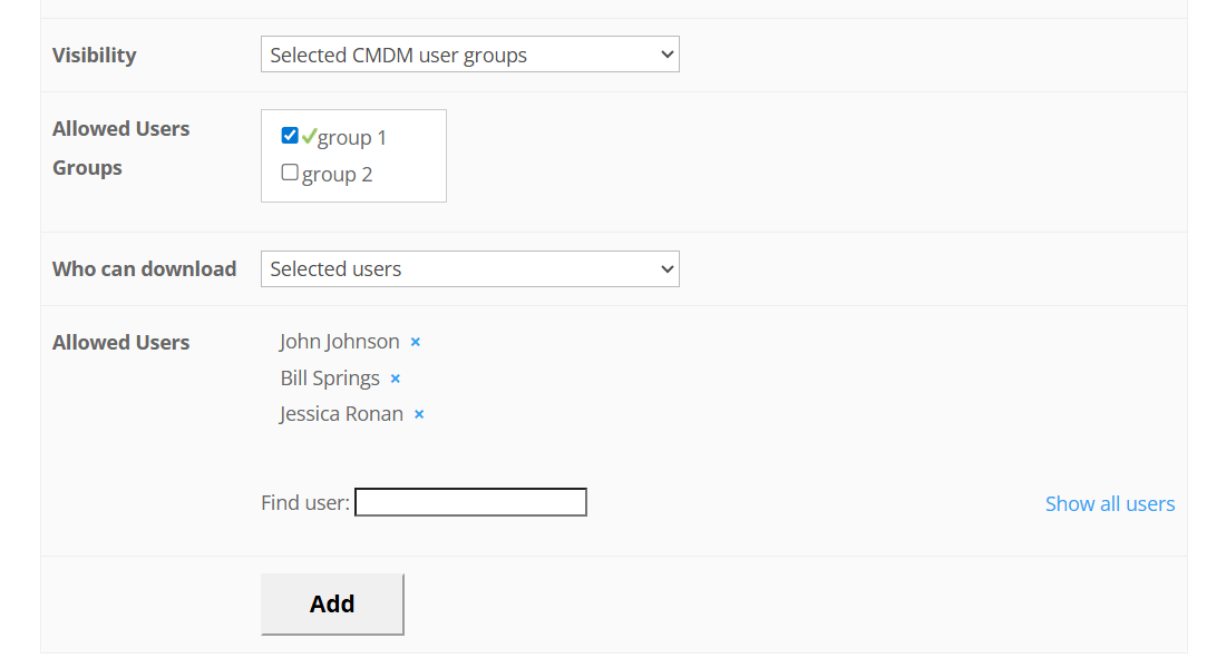 Set access settings to grant permissions for individual users or user groups to view or upload files.